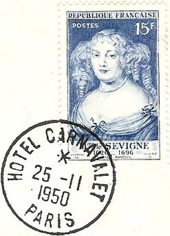 Париж. Первый день марки М892. Памятный текст (Hotel Carnavalet — дом маркизы де Севинье, в котором сегодня находится Музей истории Парижа [Музей Карнавале])..