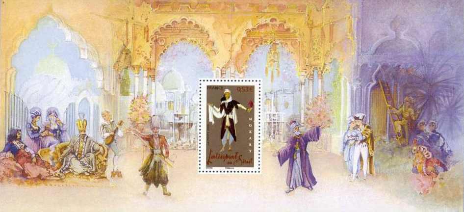 Марка издана также в двух блоках. На поле одного — портрет Моцарта, на поле другого — сцены из оперы.
