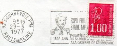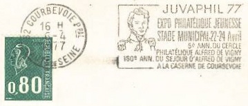 Курбевуа. Филателистическая выставка «Juvaphil 77». 160-летие пребывания Альфреда де Виньи в казарме Курбевуа. Портрет Альфреда де Виньи (машинный).