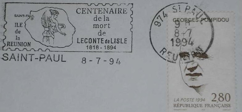 Сен-Поль. 100 лет со дня смерти Леконта де Лиля. Силуэт острова Реуньон, муза (машинный).