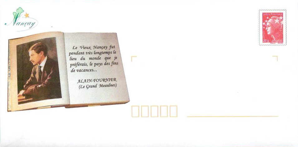 На конверте: раскрытая книга Анри Алена-Фурнье «Большой Мольн» со словами о городе Нансе и портретом Анри Алена-Фурнье.