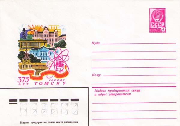 375 лет Томску. Архитектурные достопримечательности города, комозиция, символизующая научную роль Томска, портальные краны на реке Томь, промышленные предприятия, лена к ордену Ленина.